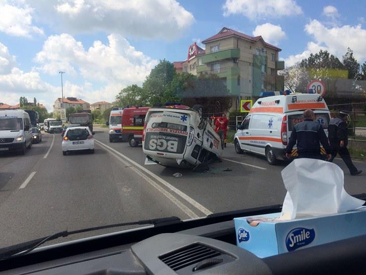 Haos în TRAFIC: ambulanță RĂSTURNATĂ la ieșire din Ovidiu!